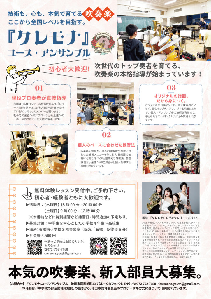 『クレモナ』ユース・アンサンブルは、池田市を拠点に活動をするプロの木管室内楽団『クレモナ』モダンタンゴ・ラボラトリのメンバーによる指導を行います。